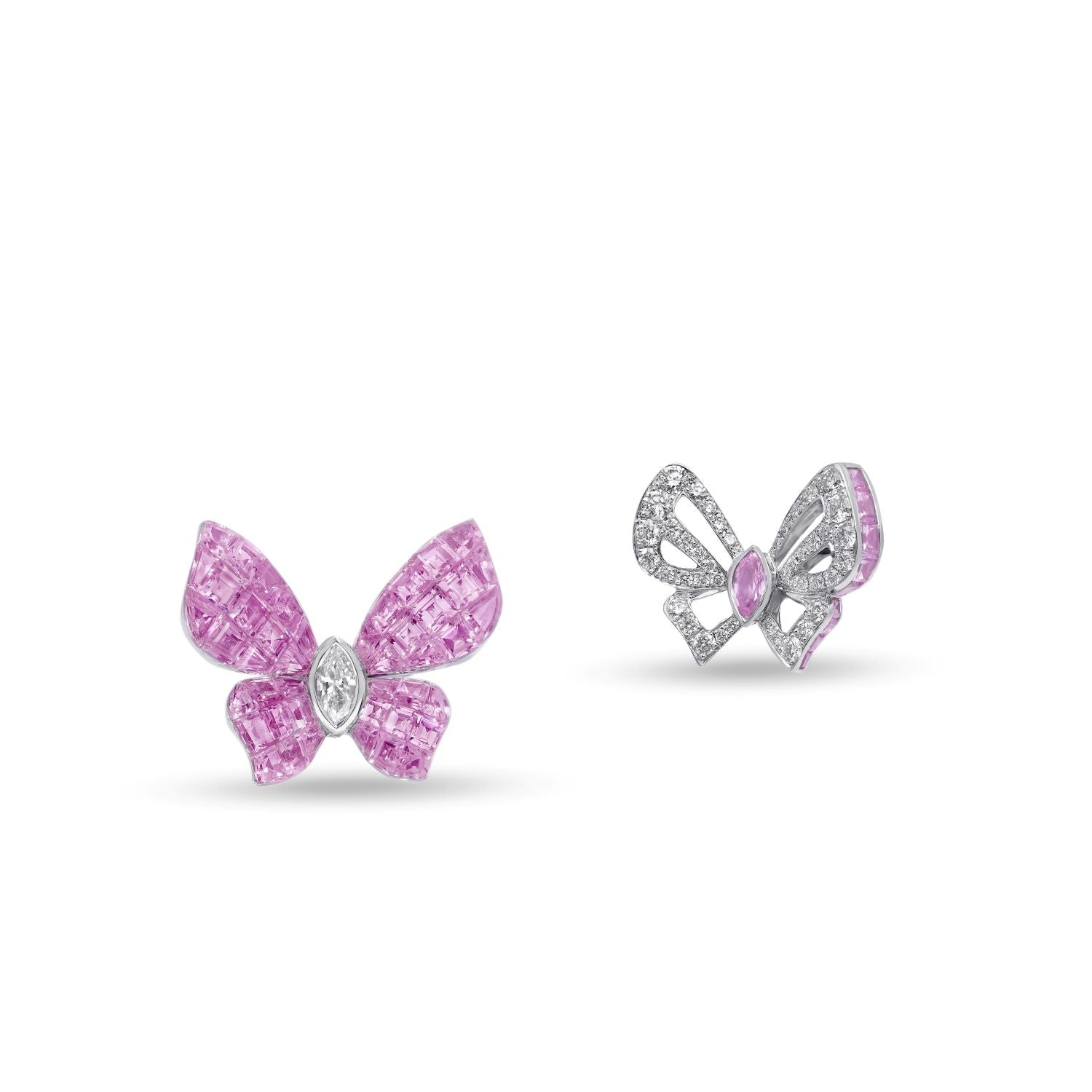 تتبع خطوط رفيعة من الياقوت الوردي غير المرئي الأوردة الدقيقة لأجنحة الفراشة، في حين يشكل الماس المقطوع على شكل ماركيز أو الأحجار الكريمة ذات الألوان النابضة بالحياة جسمها الرشيق.