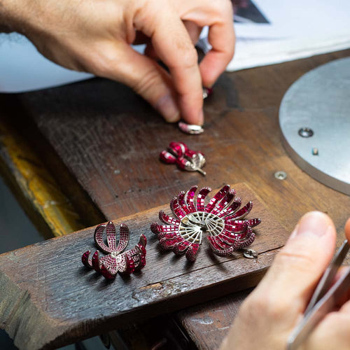 KS: Our very first impactful creations were made using our signature invisible setting. It was a group of parrot brooches and objects de vertu set in tsavorites, rubies, blue and orange sapphires, inspired by my travels through the Amazon River. In order to recreate the bird’s plumage, each feather had to be singularly attached to a central gold structure and secured with long pins to ensure a three-dimensional result. Countless people came to see these parrots on display at an exhibition, and so we decided to evolve the collection and present some important unique pieces for every upcoming show. One of them – the recent Chrysanthemum necklace from The Noble Ones collection - marked another pivotal moment, as we move into more sculptural jewels. The workmanship of this piece is of staggering complexity, both in its three-dimensional effect and the setting of the stones. If you take a close look at the petals you will see that rubies embellish even those parts that are not instantly visible.