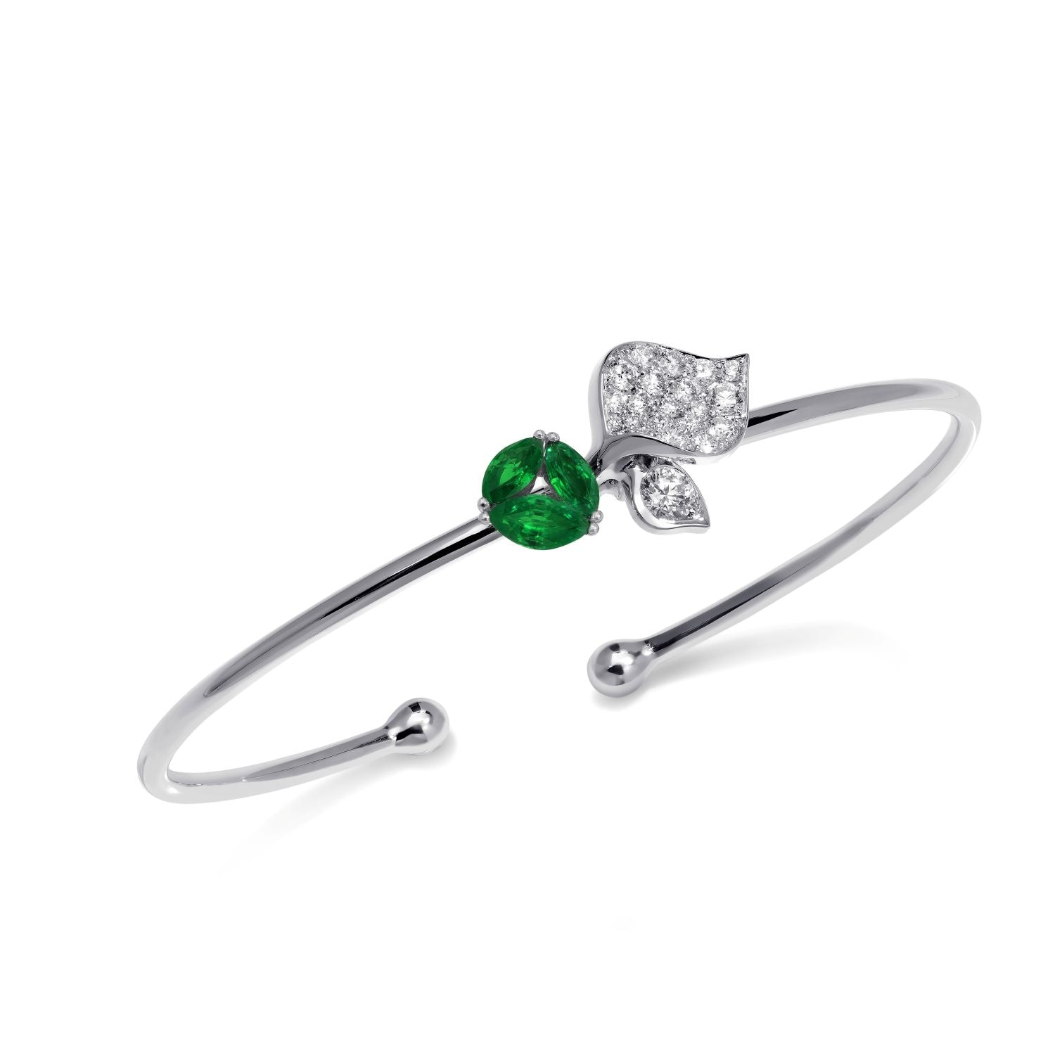 The À Fleur de Paris Tsavorite Bangle combines elegance and ease with its flexible, open design, allowing for effortless wear. Crafted in 18k gold, the bangle features a delicate petal motif set with shimmering diamonds and vibrant marquise-cut tsavorites, forming a bold centrepiece. Lightweight and refined, this piece is perfect for adding a touch of Parisian charm to your everyday style while celebrating the beauty of nature’s delicate blooms.